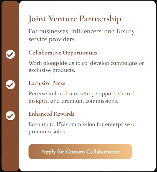 Affiliates earn 10% on referrals, with JV Partners earning up to 15% for premium collaborations.